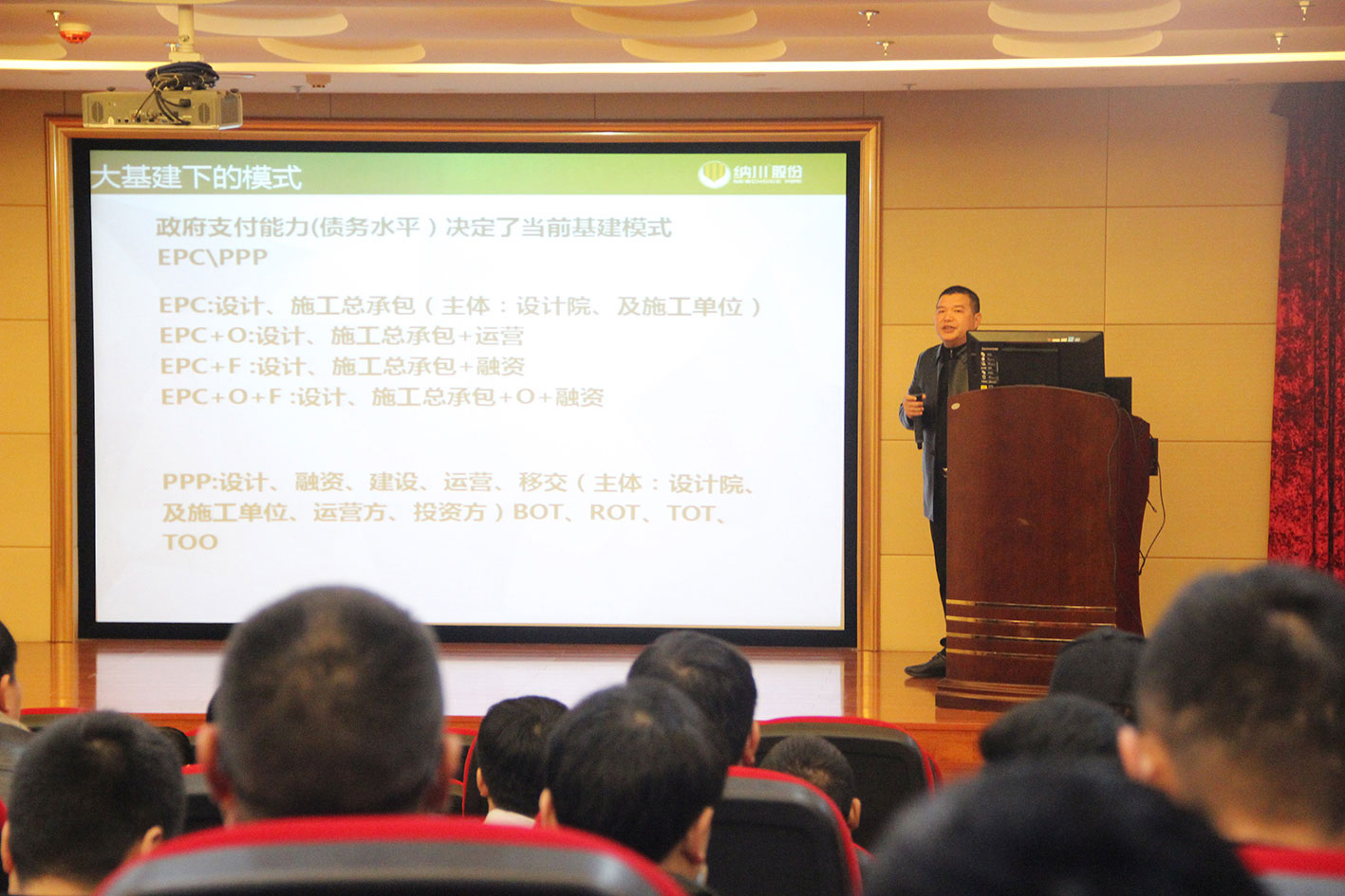 納川股份董事長助理傅義營根據(jù)當前市場環(huán)境、結(jié)合國家對基礎(chǔ)建設(shè)投資環(huán)境鼓勵政策,對大基建下的模式和EPC、PPP模式不同的基建工程模式下,對應(yīng)的雨污管網(wǎng)、城市給水的管道產(chǎn)品銷售模式及配套的解決方案作了細致講解。