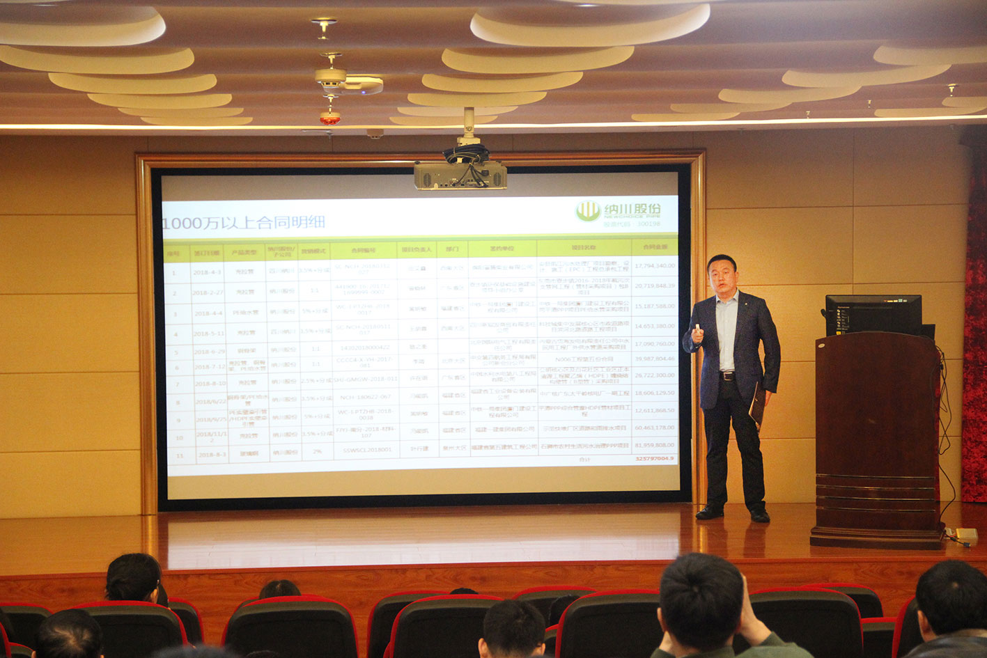 納川管業(yè)總經(jīng)理林藝輝從2018年銷售情況、未來趨勢、業(yè)務(wù)要求三個方面作了講解。并對全體銷售人員的辛勤付出及全力支持表達了由衷感謝,對未來工作發(fā)展中心和方向做出要求。